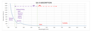 Công nghệ đo: hấp thu phân tích quang phổ UV-VIS (200-700nm) hoặc suy giảm cường độ (attenuation)